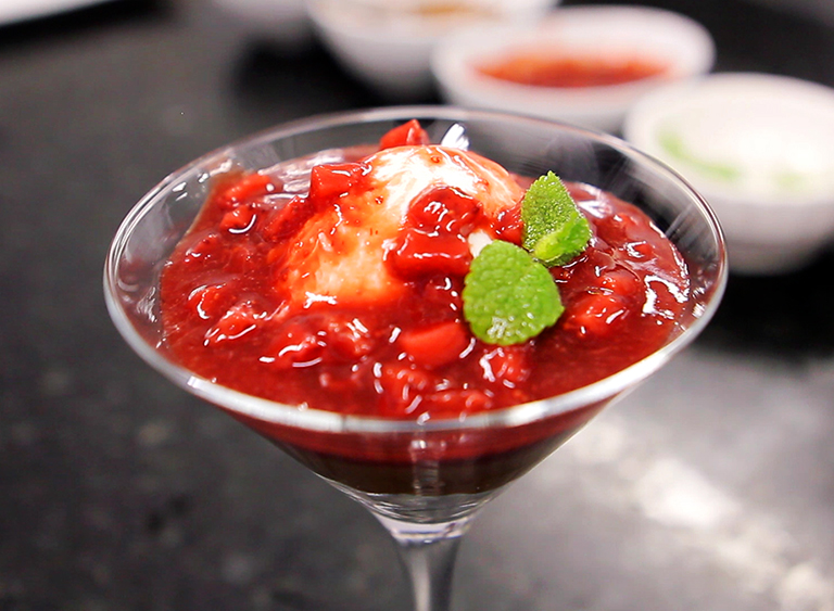 Ele é montado numa taça e leva Crumble de maçã, doce de leite argentino, sorvete de coco e uma deliciosíssima compota de morango. Não é uma sobremesa grande, mas serve tranquilamente até duas pessoas.