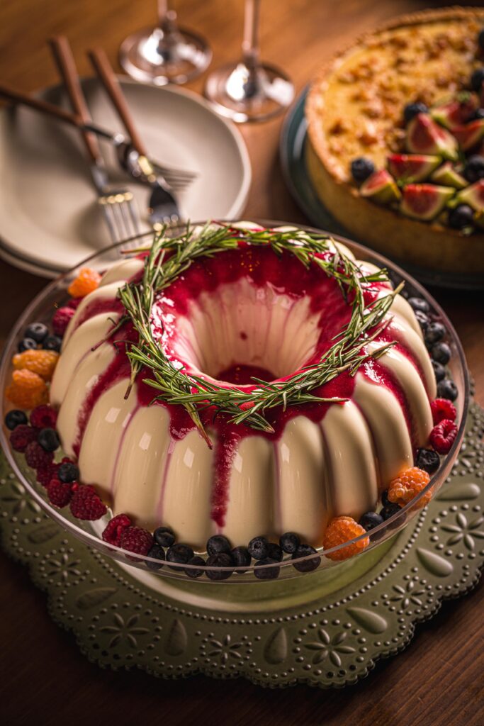 O capítulo doce da ceia começa com três sobremesas que traduzem delicadeza, textura e muita presença à mesa. A Pannacota de Cardamomo (R$ 320), preparada no estilo Bundt Cake, é leve, perfumada e servida com coulis artesanal de framboesas e frutas frescas. Já a Cheesecake de Blueberry (R$ 290), destaca a generosidade das berries, com massa sablée e coulis de frutas vermelhas. Por fim, o Risgrøt de Pistache (R$ 280), traz o melhor da cozy food nórdica: arroz cremoso com cardamomo e especiarias, finalizado com creme de pistache e amêndoas laminadas tostadas.