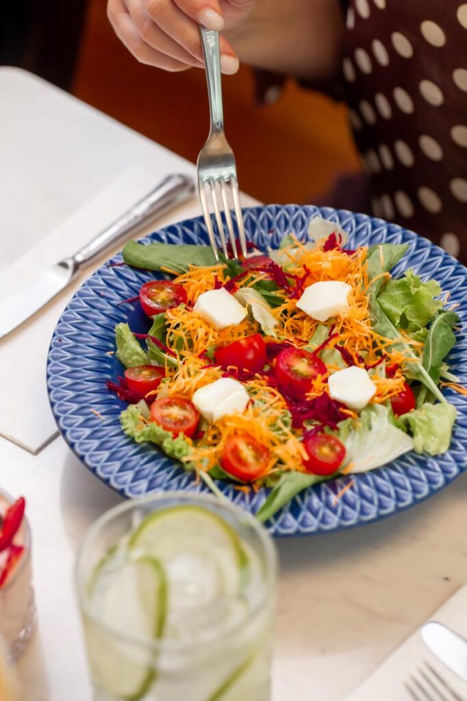 Há ainda três tipos de salada — a vegetariana colorida, a Caesar e a versão com atum — além de porções à parte de salada de frutas e iogurte para quem busca algo mais leve.