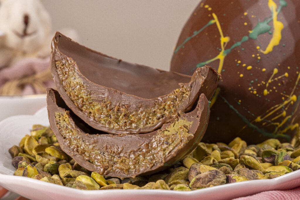Para presentear, a confeitaria também aposta em mimos de chocolate, como as barras produzidas com chocolate belga. Entre elas estão a versão ao leite 33% com crocante de Dubai e pistache (R$ 47) e a meio amargo 54% com caramelo salgado (R$ 38), opções práticas para presentes ou para compor cestas de Páscoa.